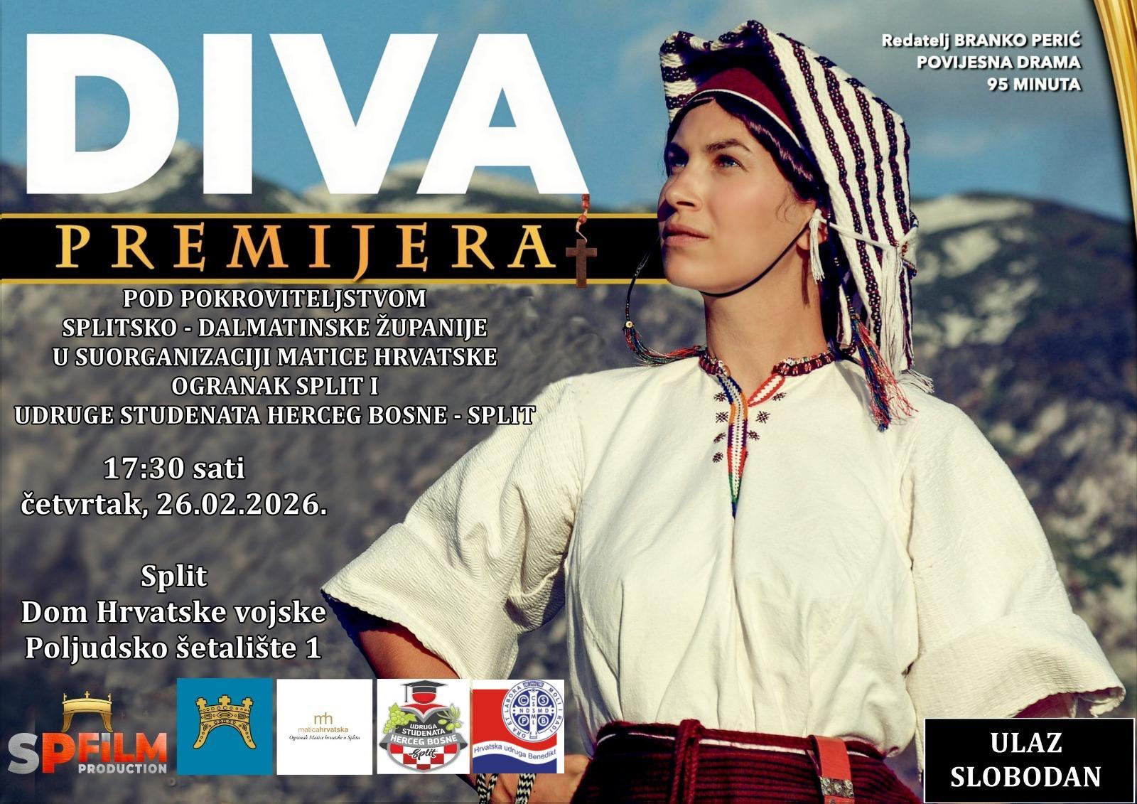 U Domu Hrvatske vojske u Splitu u četvrtak, 26. veljače 2026., s početkom u 17:30 sati, bit će premijerno prikazan film „DIVA“, snažna i dojmljiva filmska priča o identitetu, emociji i unutarnjoj snazi povijesne junakinje Dive Grabovčeve, a ulaz na projekciju je slobodan. Film donosi intiman i vizualno impresivan portret žene koja je kroz stoljeća ostala […]