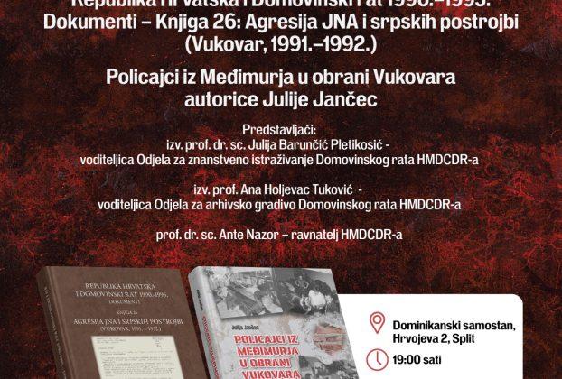 Hrvatska udruga Benedikt i Muzej Domovinskog rata u Splitu pozivaju na promociju dviju knjiga izdanih u sklopu Hrvatskog memorijalno-dokumentacijskog centra Domovinskog rata: „Republika Hrvatska i Domovinski rat 1990.–1995. Dokumenti – Knjiga 26: Agresija JNA i srpskih postrojbi (Vukovar, 1991.–1992.)“ „Policajci iz Međimurja u obrani Vukovara“, autorice Julije Jančec O izdanjima će govoriti: izv. prof. dr. sc. … Nastavi čitati Predstavljanje izdanja Hrvatskog memorijalno-dokumentacijskog centra Domovinskog rata i otvorenje 12. Tjedna sjećanja na Vukovar i Škabrnju
