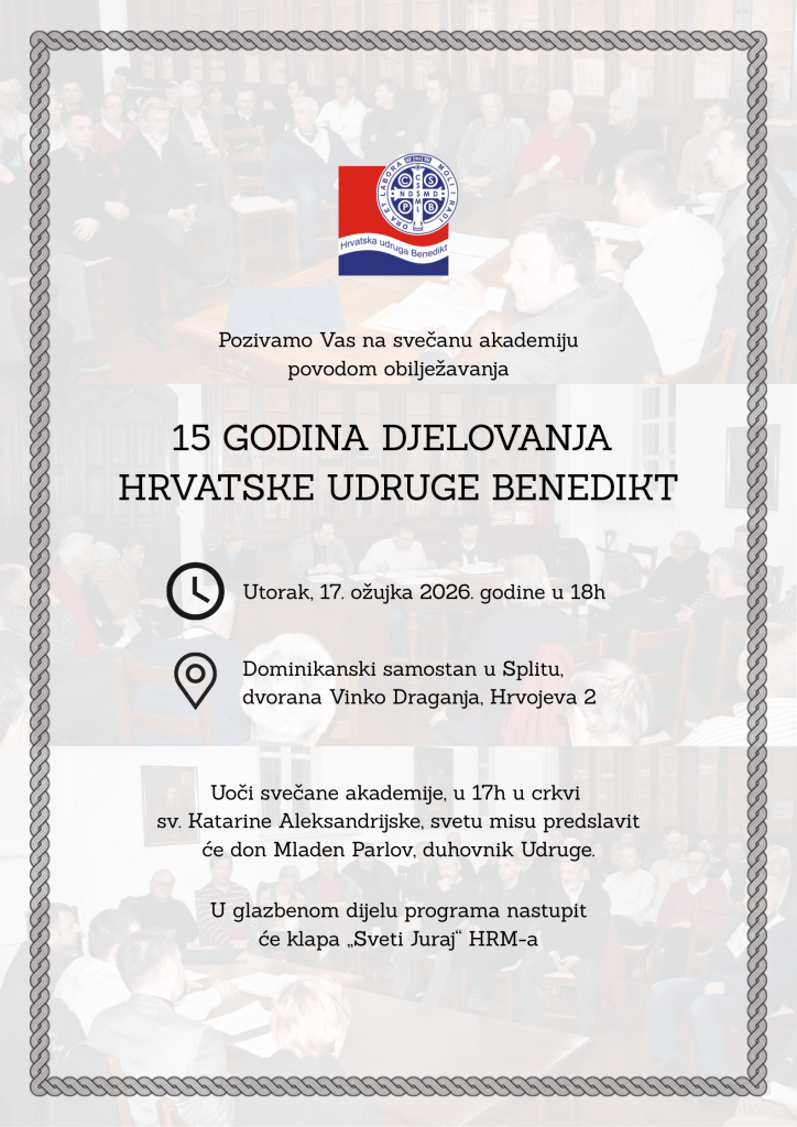 Hrvatska udruga Benedikt obilježava petnaest godina djelovanja tijekom kojih je ostvarila niz kulturnih, društvenih i duhovnih aktivnosti usmjerenih na promicanje kršćanskih vrijednosti, očuvanje hrvatskog identiteta te njegovanje europske kulturne baštine.