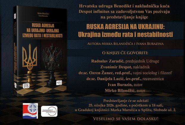 Hrvatska udruga Benedikt i nakladnička kuća Despot infinitus organiziraju predstavljanje knjige „Ruska agresija na Ukrajinu: Ukrajina između rata i nestabilnosti“ autora dr. sc. Mirka Bilandžića i dr. sc. Ivana Burazina, koje će se održati u srijedu, 25. ožujka 2026. u 18 sati u Gradskoj knjižnici Marka Marulića u Splitu (Slobode ul. 2). Knjiga je rezultat 12 godina istraživanja, a donosi analizu uzroka i posljedica ukrajinske … Nastavi čitati Predstavljanje knjige o ruskoj agresiji na Ukrajinu u Splitu