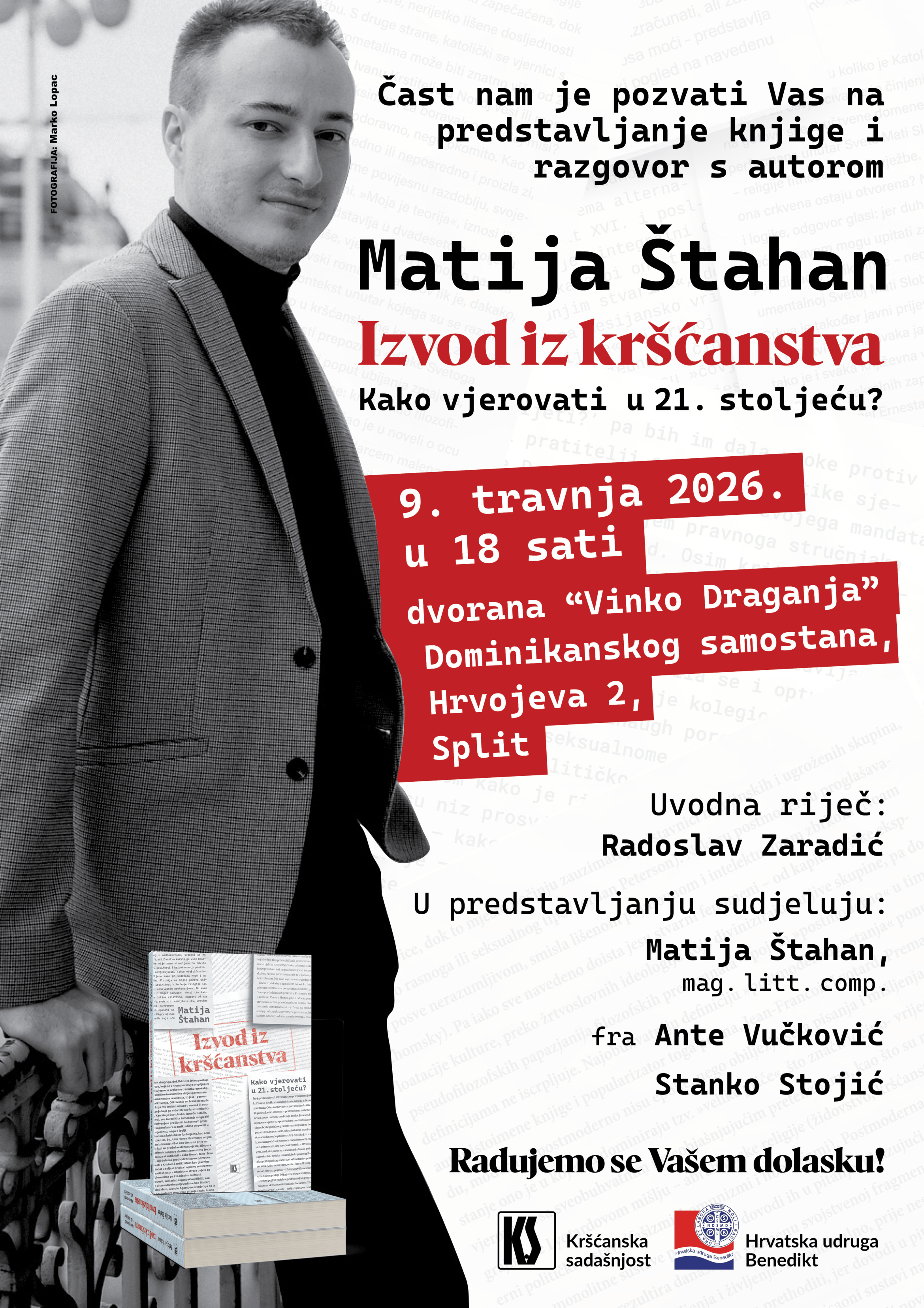 U vremenu u kojem se sve češće postavlja pitanje mjesta vjere u javnom prostoru, u Splitu će biti predstavljena knjiga „Izvod iz kršćanstva – Kako vjerovati u 21. stoljeću?“ autora Matije Štahana – djelo koje na jasan, argumentiran i intelektualno ozbiljan način otvara ključna pitanja suvremenog kršćanskog života. Predstavljanje će se održati u četvrtak, 9. travnja 2026. […]